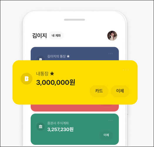은행업무를 카카오뱅크 앱 하나로 예금, 적금, 대출, 해외송금, 체크카드, 모임통장, 내 신용정보까지