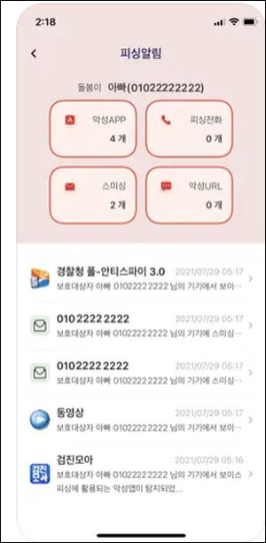 - 전화 가로채기 앱, 금융기관 및 공공기관 사칭 앱 등 다양한 유형의 악성 앱 탐지
