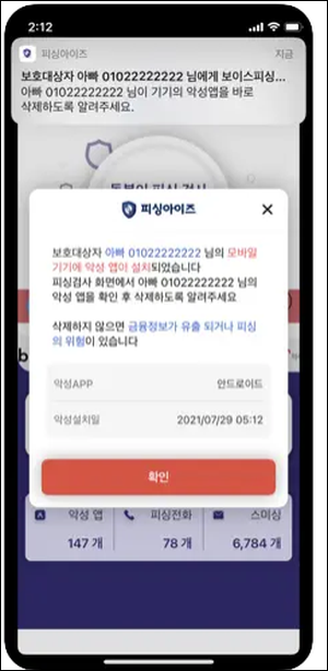 피싱아이즈는 제휴금융사와 다양한 유형의 피싱에 대해 공동으로 분석하고 대응함으로써, 이용자들에게 최적의 예방의 솔루션을 제공합니다. 피싱아이즈는 나의 가족 및 지인의 휴대폰에서